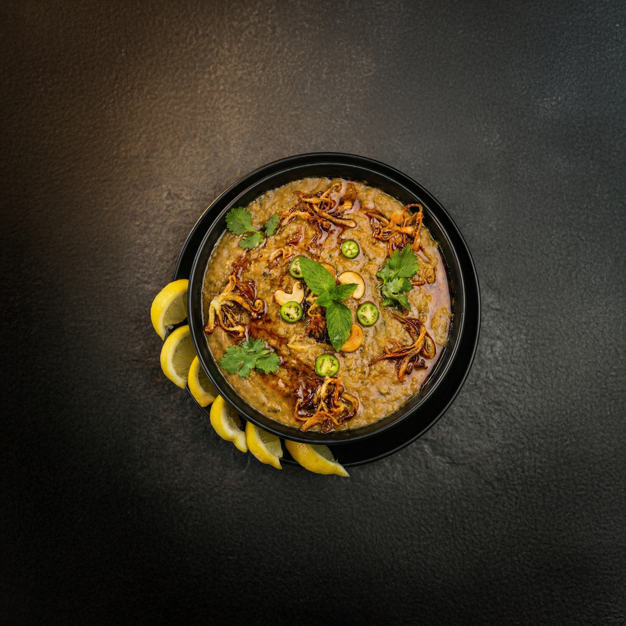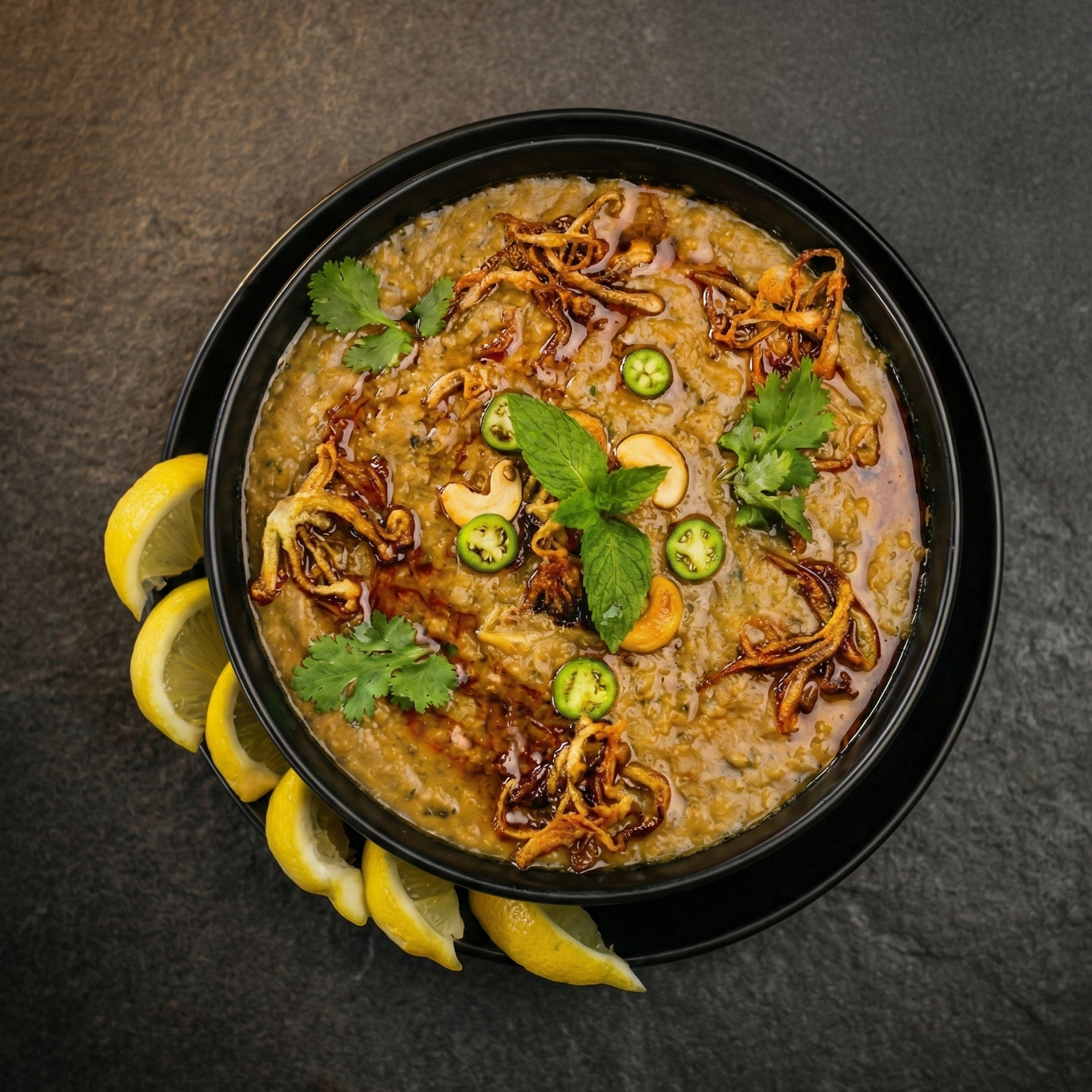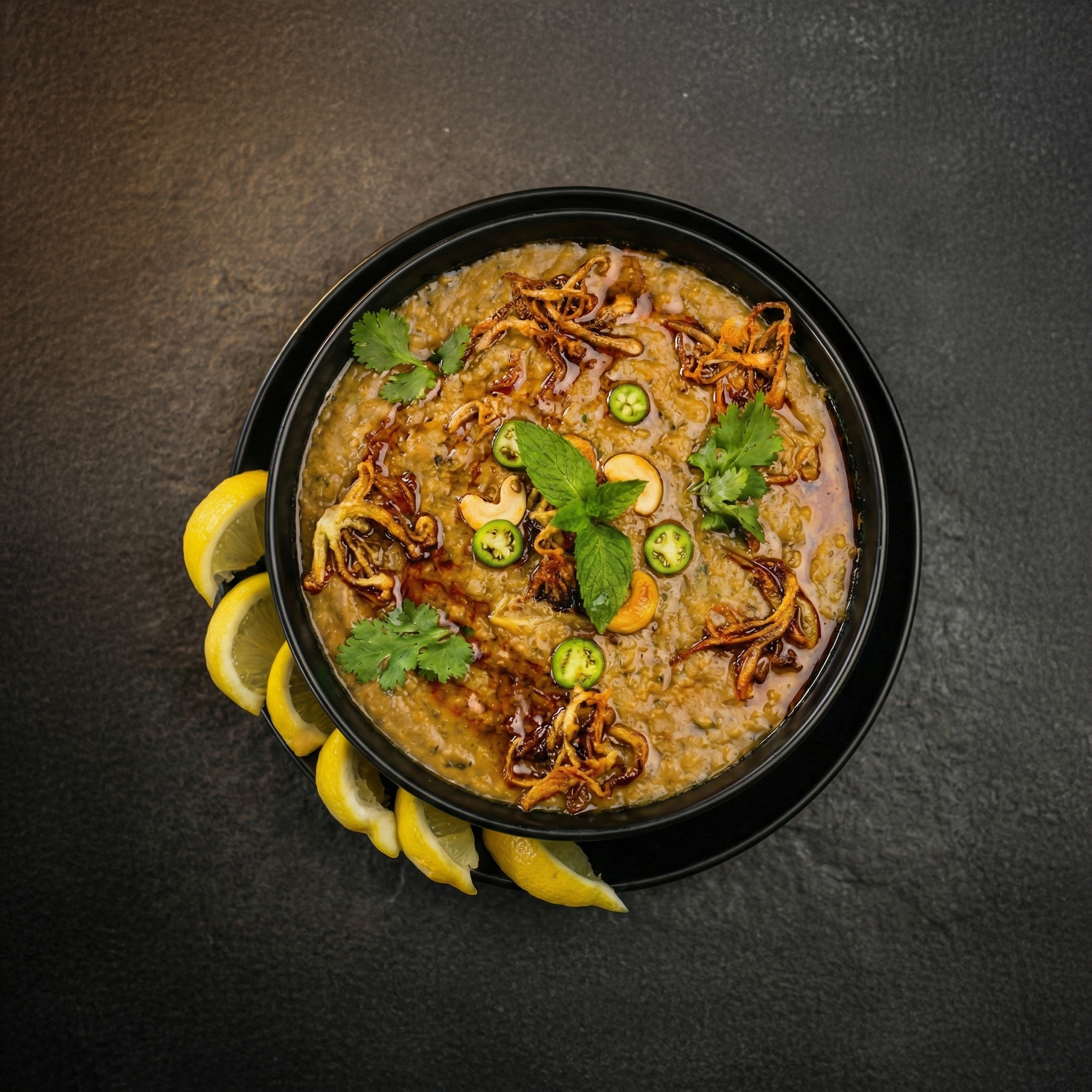 Slow-cooked to perfection, our Haleem is rich, creamy, and deeply flavorful — topped with crispy fried onions, fresh herbs, and a touch of ghee for the ultimate indulgence.