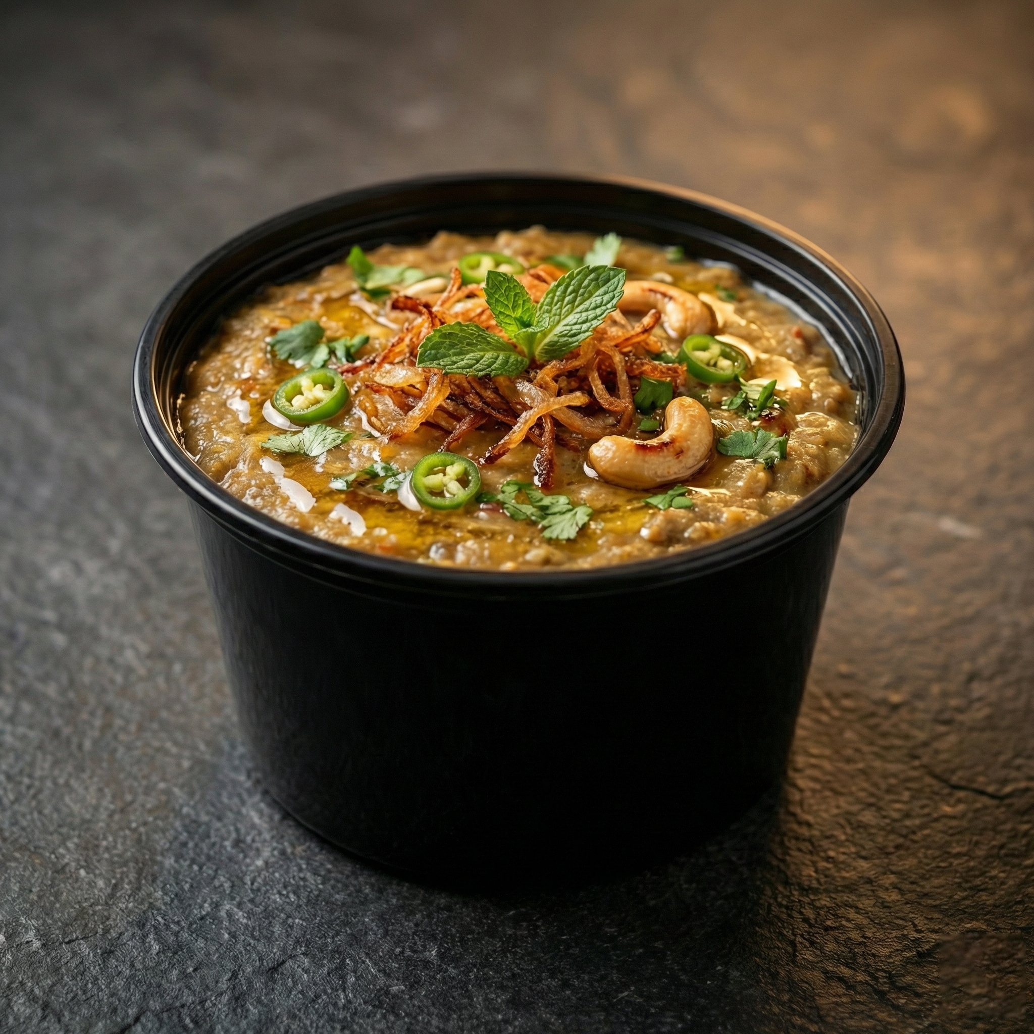 Slow-cooked to perfection, our Haleem is rich, creamy, and deeply flavorful — topped with crispy fried onions, fresh herbs, and a touch of ghee for the ultimate indulgence.